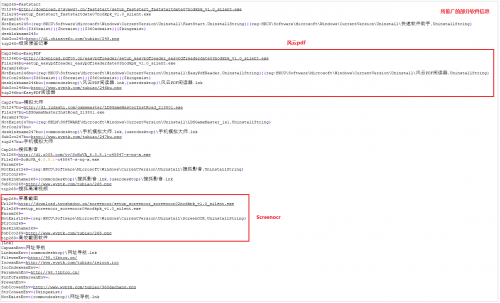 ![]() 推广软件的部分配置信息 本次commander恶意程序主要通过风云PDF阅读器和高效截图软件安装包进行投放,并且在安装上述流氓软件后,在开始菜单、桌面等位置均未创建相关的启动快捷方式,导致用户难以发现该软件的存在。流氓软件文件信息,如下图所示: